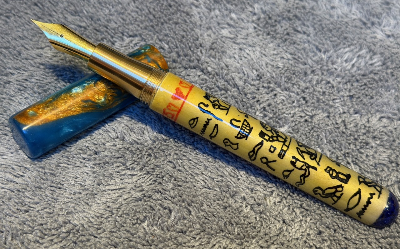Die Idee entstand, als ich die Glasröhrchen von den Vanille-Schoten aufgeräumt habe. Der Durchmesser war gut und sie lagen schön in der Hand. Wie macht man dazu ein schönes Design? Und geht das überhaupt? Ich hatte schon länger die Vorstellung von einem Füllfederhalter mit Hieroglyphen. Die beiden Ideen habe ich einfach verbunden. So ungefähr war…